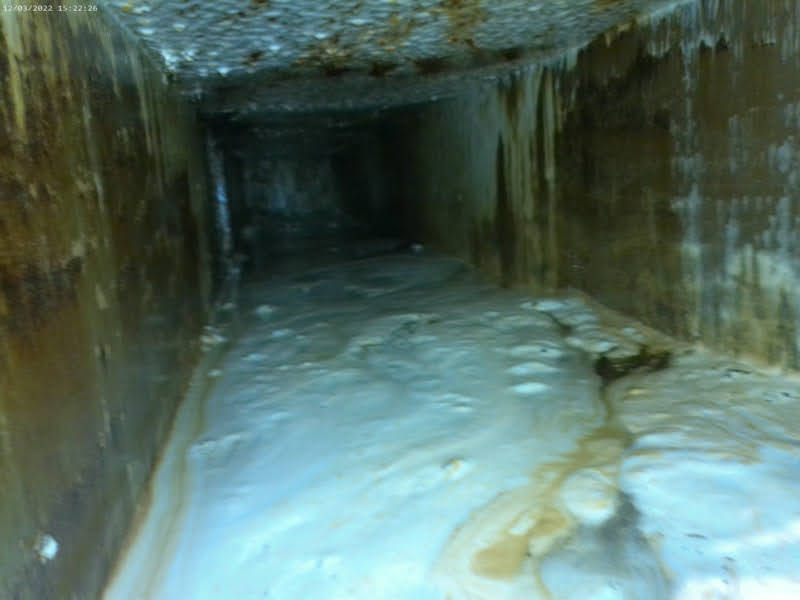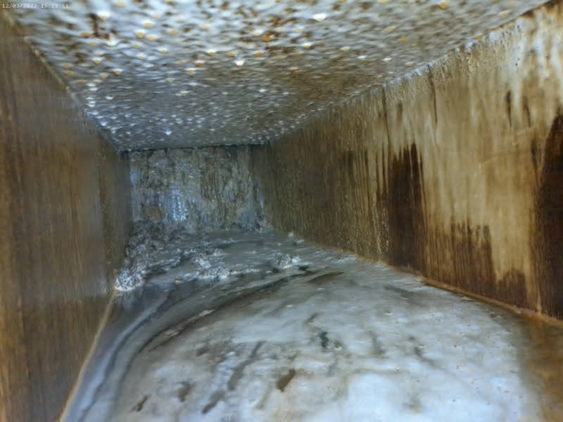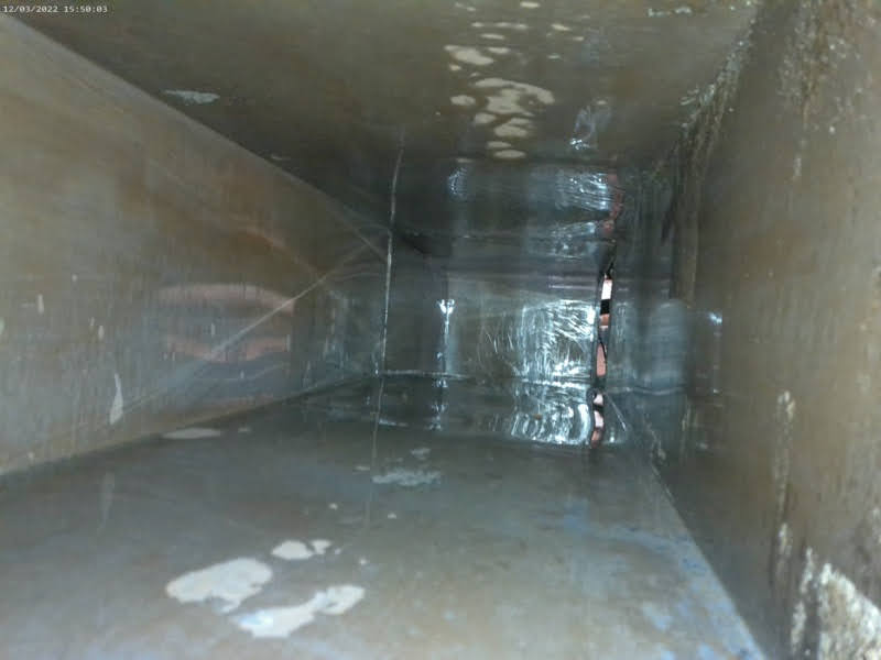 Next, we applied a powerful foaming degreaser that clings to all surfaces of the kitchen exhaust system. This degreaser penetrates the grease and oily sludge, breaking it down and making it easy to rinse away. This thorough cleaning technique ensures that every inch of the exhaust system is clean and restored.